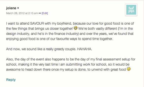 So how do you win this? Just leave a comment telling me who you would like to attend this event with and why! This giveaway will end on Thursday 29th of March 2012 at 5pm, and the winner will be announced and notified at 8pm (Singapore time). I do apologise for this short period of time to enter the giveaway, but I assure you, it’s an event you food lovers wouldn’t want to miss!