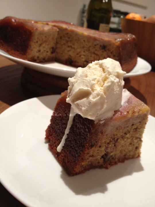 The recipe calls for maple syrup. I walked the aisles of the supermarket and contemplated on the maple flavoured syrup, as I never really wanted to spend almost $10aud on a bottle of pure maple syrup. But I decided to spoil ourselves and got a bottle of the real stuff and boy was I glad I did. It adds a unusual nutty flavour to the cake, which was perfect! The sour cream made the cake really soft and moist. And nothing could beat the smell of banana cake baking in the oven. It fills the whole house with the yummy aroma which makes you wanna dive your fork into it immediately once it’s taken out of the oven!