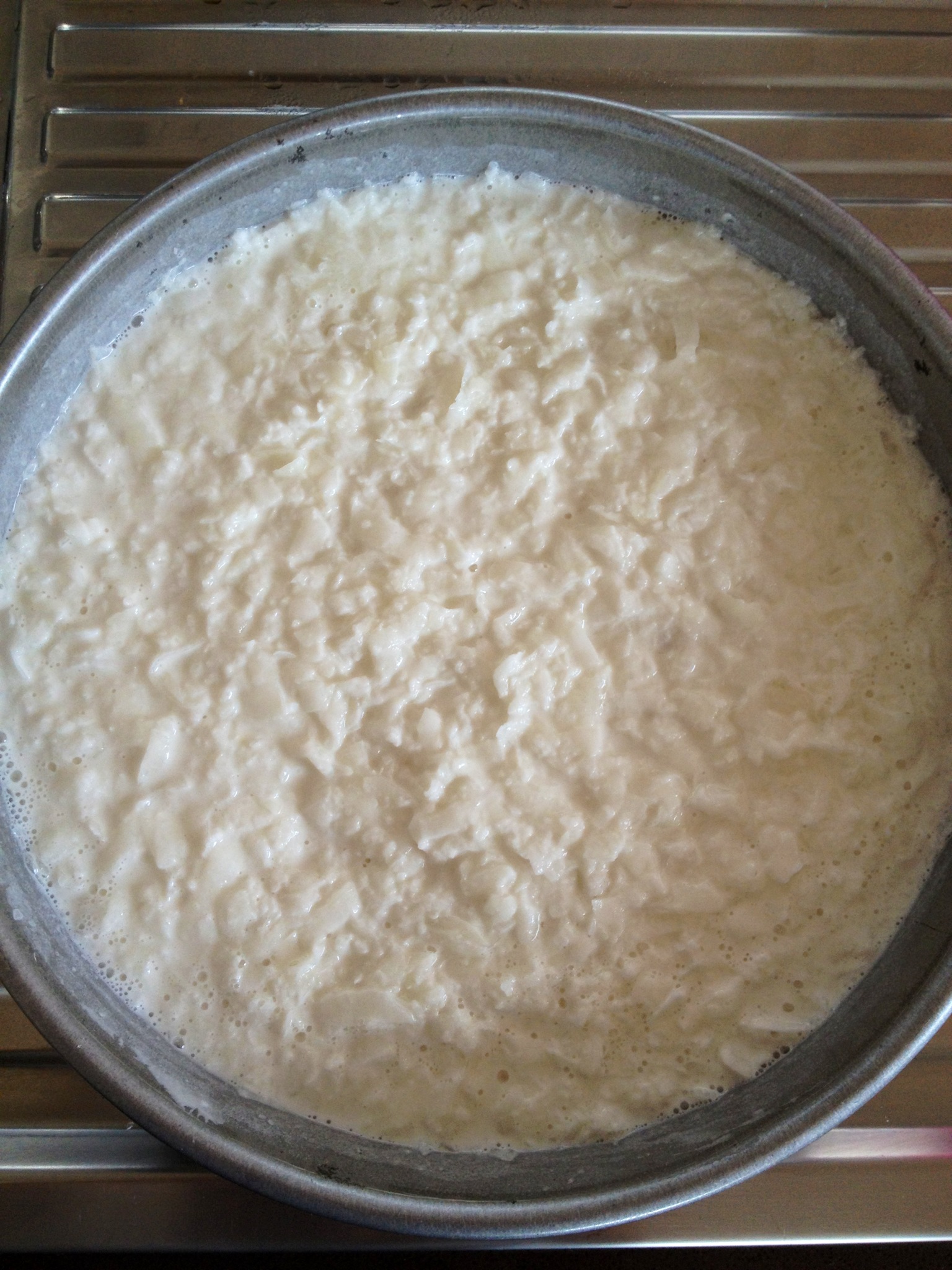 3) Add the rice flour solution to the cooled grated radish. Stir and mix it well, then pour into a round metal cake tin. The mixture will look like a watery coleslaw. Steam the mixture for 45 minutes on high heat.