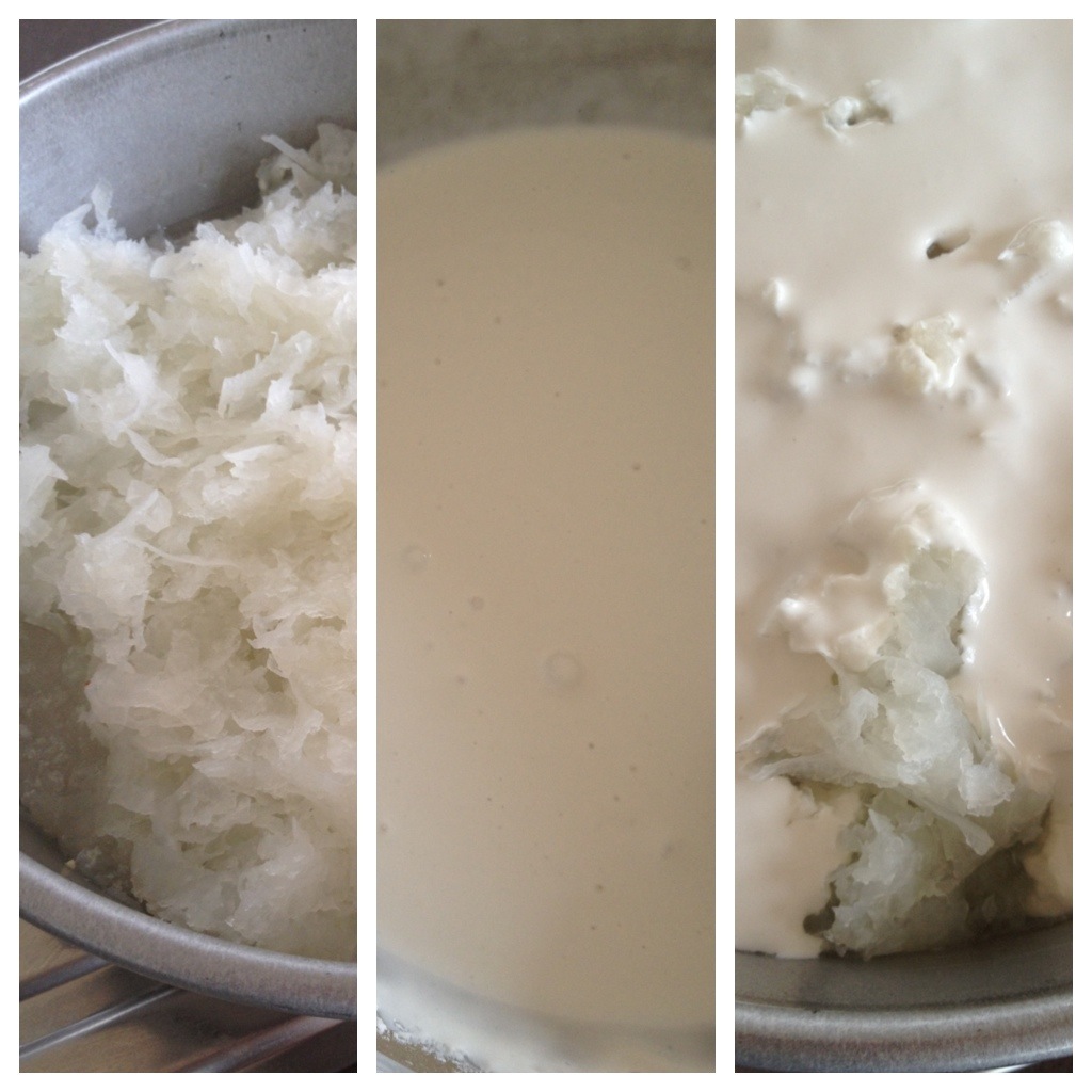 1) Over a very low flame, steam the grated radish and 50ml of water for about 30 minutes or until the radish turns translucent. Set aside and allow it to cool.