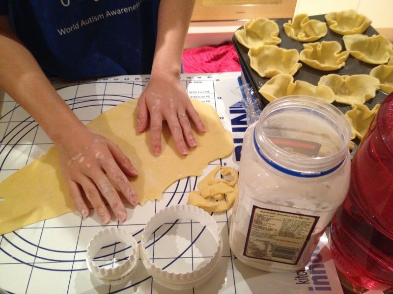 6) Preheat oven to 190 degrees celcius. Grease 12 holes in a cupcake baking tin with butter (or 6 in a muffin tin). Roll out the pastry to 3-5mm, using a little extra flour for dusting. Cut out 12 rounds about 4 cm bigger than the cupcake holes and another 12 rounds that are about 2 cm larger for the lids.