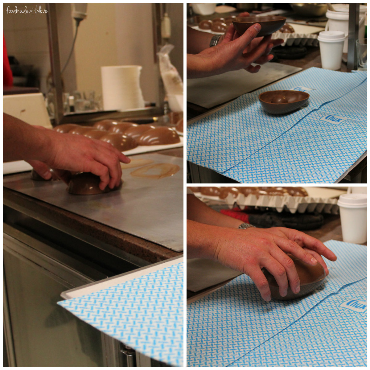 We piped the salted caramel into the small egg shells that were made prior to our arrival and they were sealed with even more chocolate before capping it with the other shell. This small chocolate ball of goodness was going to be placed within our large chocolate egg!