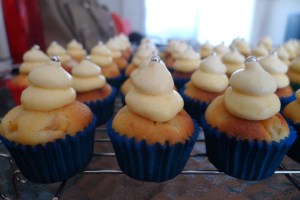 6) To assemble : Cut a whole in the middle of the cupcakes, big enough to fill 2 tsp of lemon curd. Fill a pipping back with the lemon curd and gently fill the holes up. Pipe the Italian meringue onto each cupcake, making sure you cover the curd completely. Using a kitchen blowtorch, carefully brown the meringue before serving.